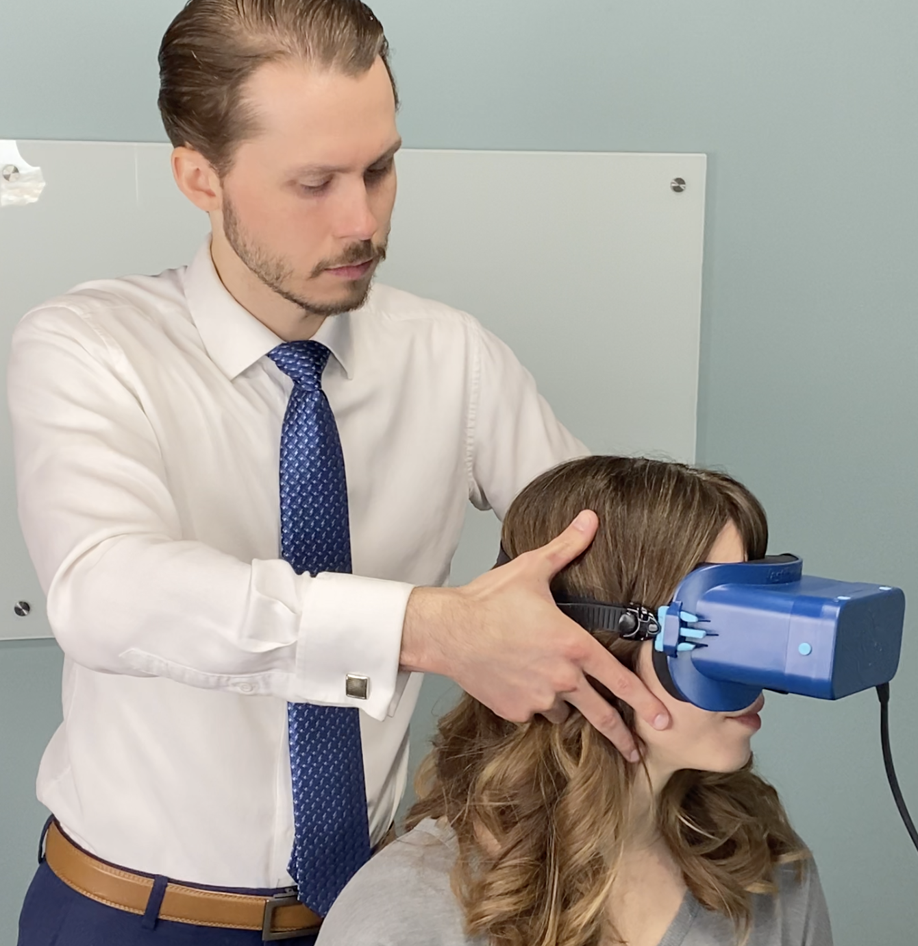 Many different issues can cause dizziness. One of the most common causes comes from the inner ear. The most accurate way to assess this is through the vestibular ocular reflex (VOR). The gold-standard way to assess the VOR is through video head impulse testing (vHIT). Our clinic has invested in the Inventis vHIT equipment. Below you will find a picture of the unit and a video from the manufacturer showing how it works.