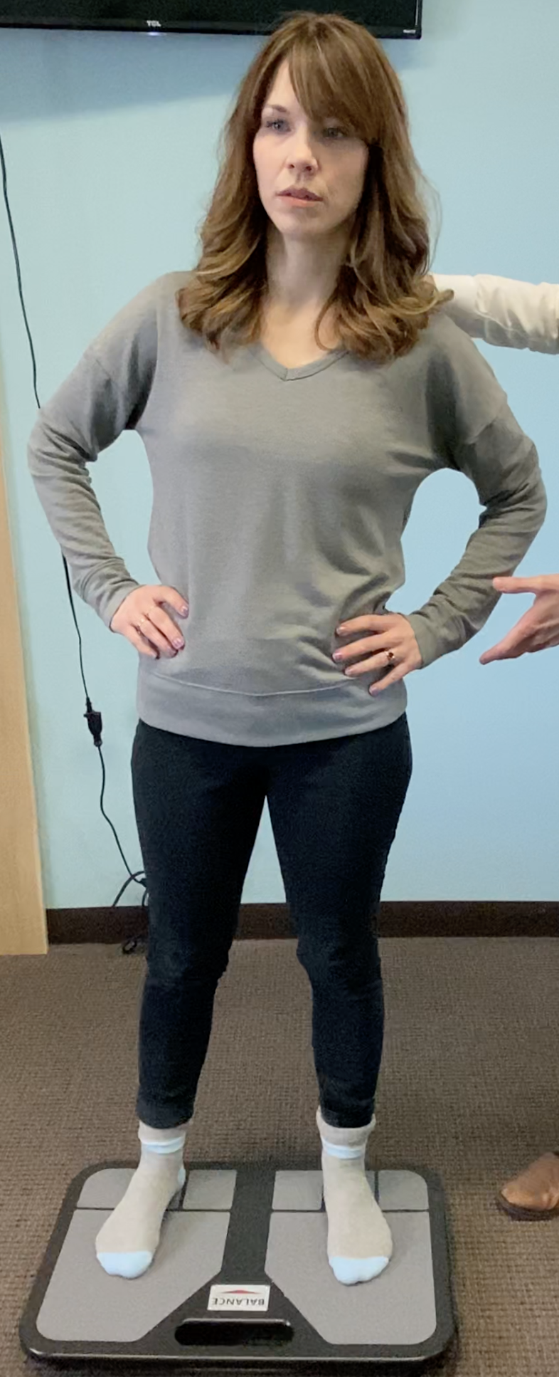 Posturography is the study of the patient’s balance in different environments. The equipment consists of a highly sensitive pressure plate that the patient stands on while the software reads how much the patient sways from their center of pressure. Not only does this equipment tell us if there is an imbalance issue, but it also helps differentiate if the problem is coming from the spine, the inner ear, the eyes, or elsewhere. The image below shows Dr. Steward conducting a posturographic evaluation with a patient.